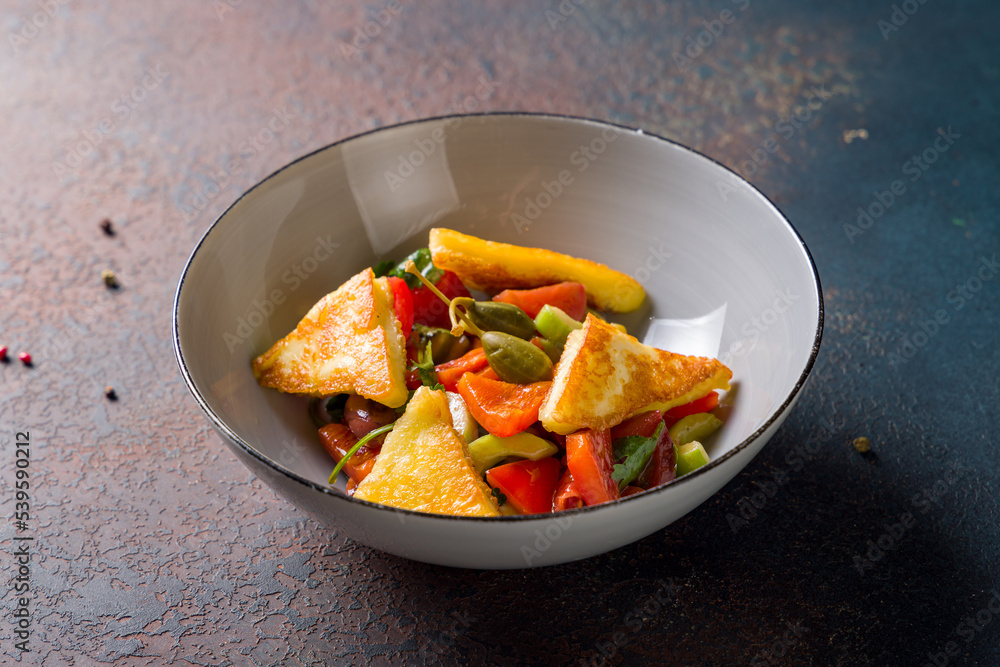 Salad with grilled halloumi cheese and vegetables on dark stone table