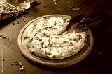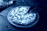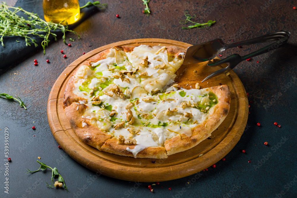 Pizza with pears and Gorgonzola cheese on the board on dark table