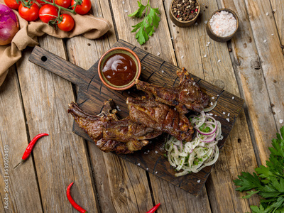 kebab from a rack of lamb on old wooden table top view