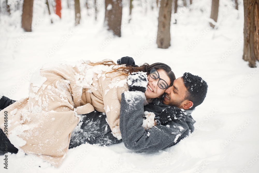 Portrait of a romantic couple lay in snow in winter forest