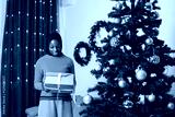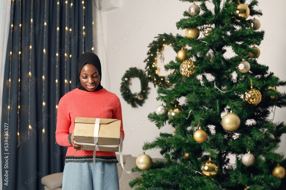 Muslim girl in black hijab standing near Christmas tree with gift box