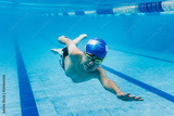 latin child boy swimmer wearing cap and goggles in a swimming underwater training In the Pool in Mexico Latin America