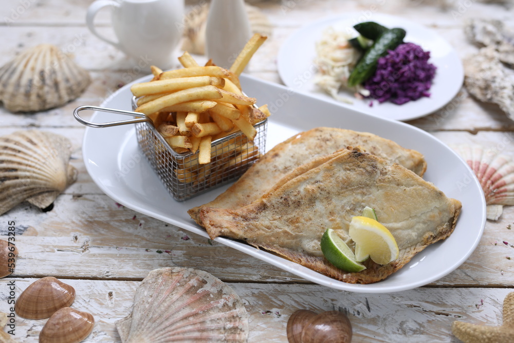 Fried flounder fillets served with fries, on a white plate, on a vintage wooden table. Fish and chips.
