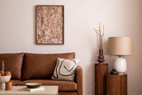 Warm and cozy interior of living room space with brown sofa, lamp, mock up poster frame, decoration, plant and wooden stand. Cozy home decor. Template.