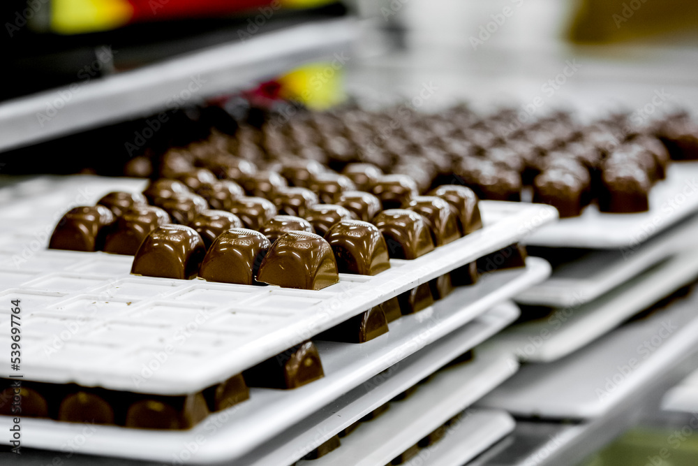 Many chocolate sweets on conveyor belt in food factory