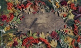 Place for text. Autumn wooden background, where there are a lot of dry leaves, berries, flowers and nuts in a pile.Useful medicinal herbs.