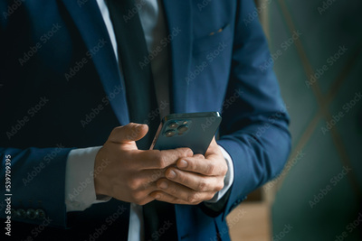Businessman in suit with mobile phone in hands. Man typing message, using social net. Checking news. Making business meeting. Modern office.General manager,ceo.Calling to partner.Planning working day