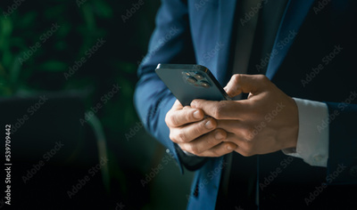 Businessman in suit with mobile phone in hands. Man typing message, using social net. Checking news. Making business meeting. Modern office.General manager,ceo.Calling to partner.Planning working day
