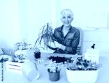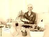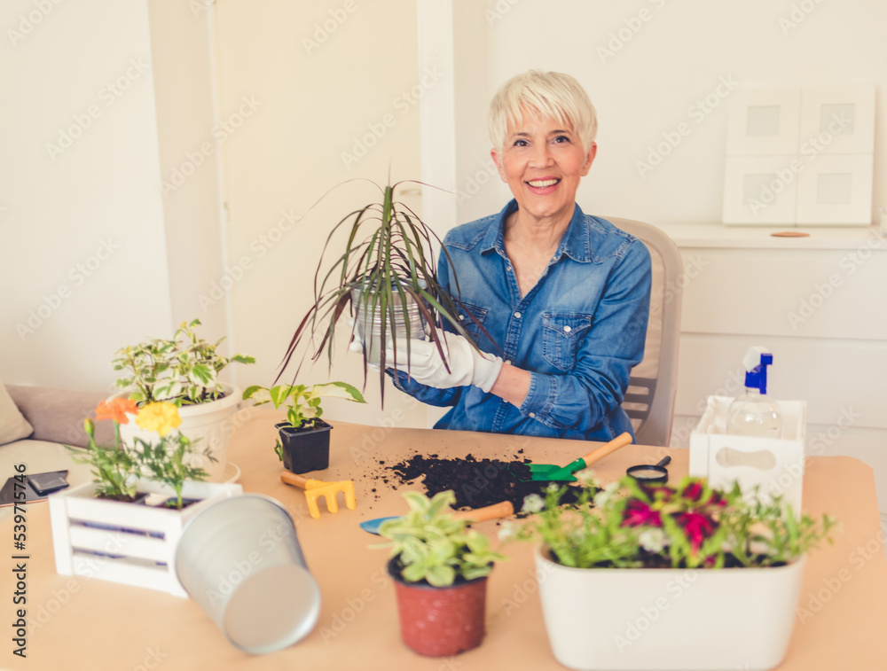 Hooby biologist pensioner woman arranges the plant in her living room.