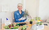 Mature woman caring for house plant. Woman taking care of plants at her home, praying a plant with pure water from a spray bottle.