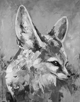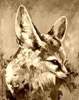 Oil fox portrait painting in multicolored tones. Conceptual abstract painting of a fennec muzzle. Closeup of a painting by oil and palette knife on canvas.
