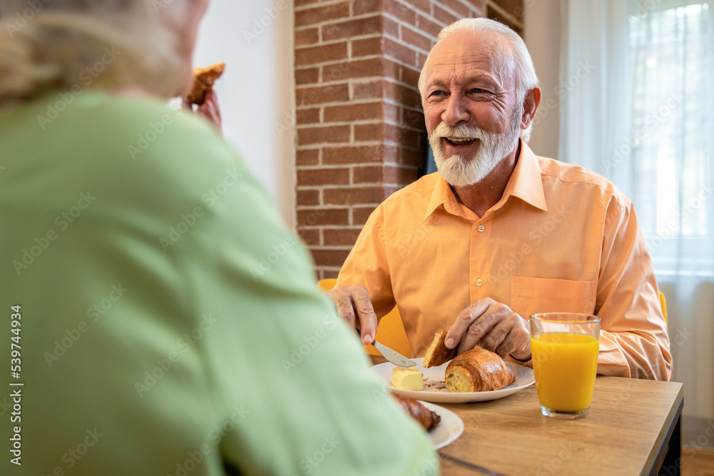 Senior couple eating breakfast at home.