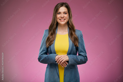 Modern business woman in blue suit. Isolated advertising portrait on pink back.