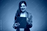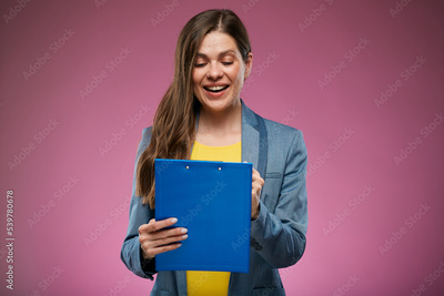 Accountant business woman wirites on clipboard, tablet. Isolated advertising portrait on pink back.