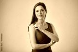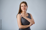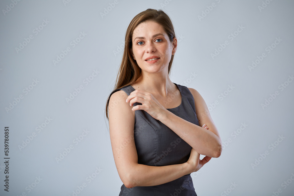 Smiling business woman office worker in gray dress isolated advertising portrait.