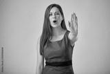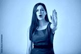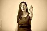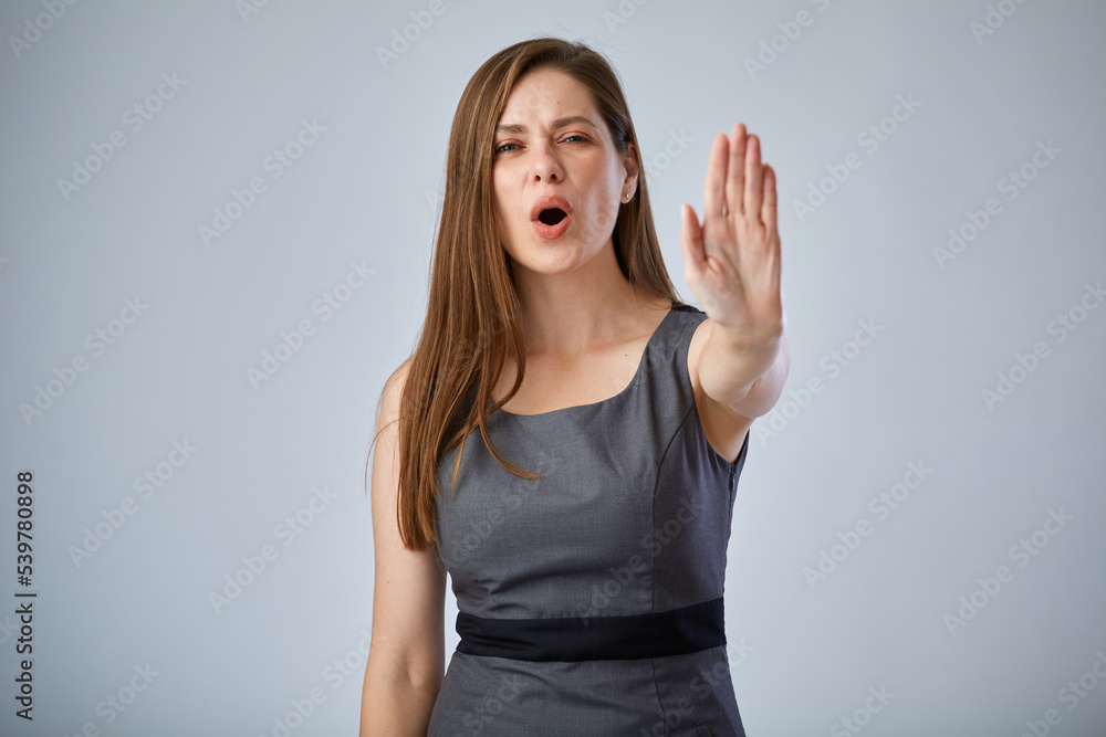 Young woman gesturing stop anger with hands. isolated female portrait.