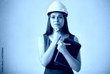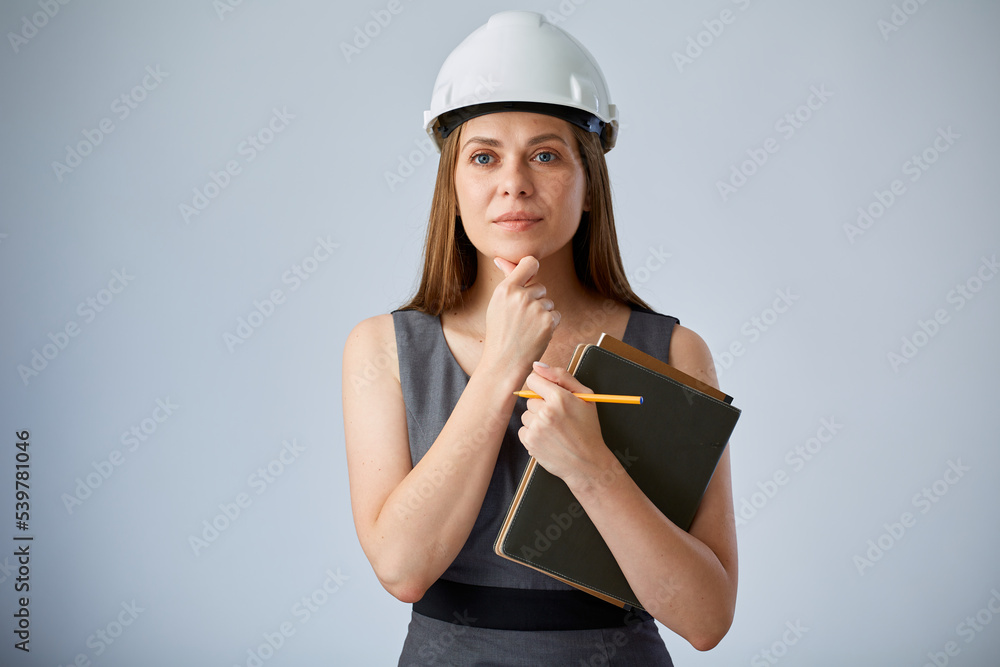 Woman engineer in white construction hardhat holding books or business paper. Isolated female worker portrait.