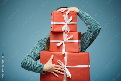 Woman holding red gift boxes stack in front of face. Advertising female studio portrait.