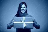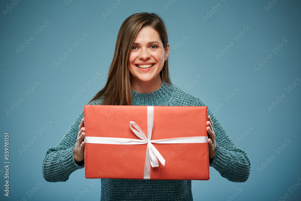 Smiling happy woman in green sweater holding red gift. Advertising female studio portrait.