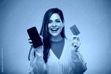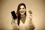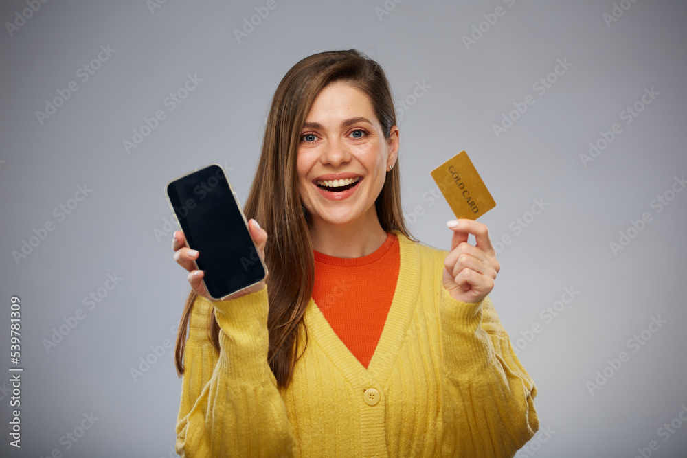 Smiling woman in yellow holding credit card and smartphone. Isolated female advertising portrait.
