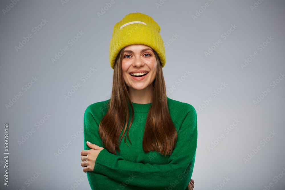 Smiling woman in casual green sweater and yellow winter hat. Advertising female studio portrait.