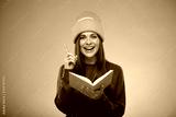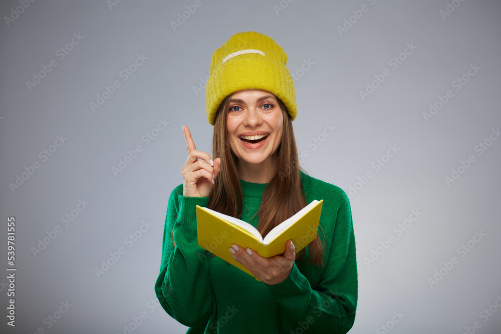 Thinking student dressed in casual teenage style holding book. Advertising female studio portrait.