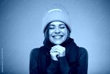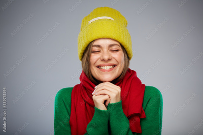 Excited happy woman in warm winter clothes with eyes closed. Isolated female portrait