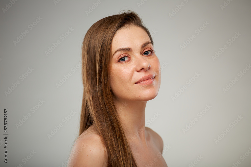 Isolated beauty portrait of young woman with bare shoulders. Close up face.
