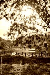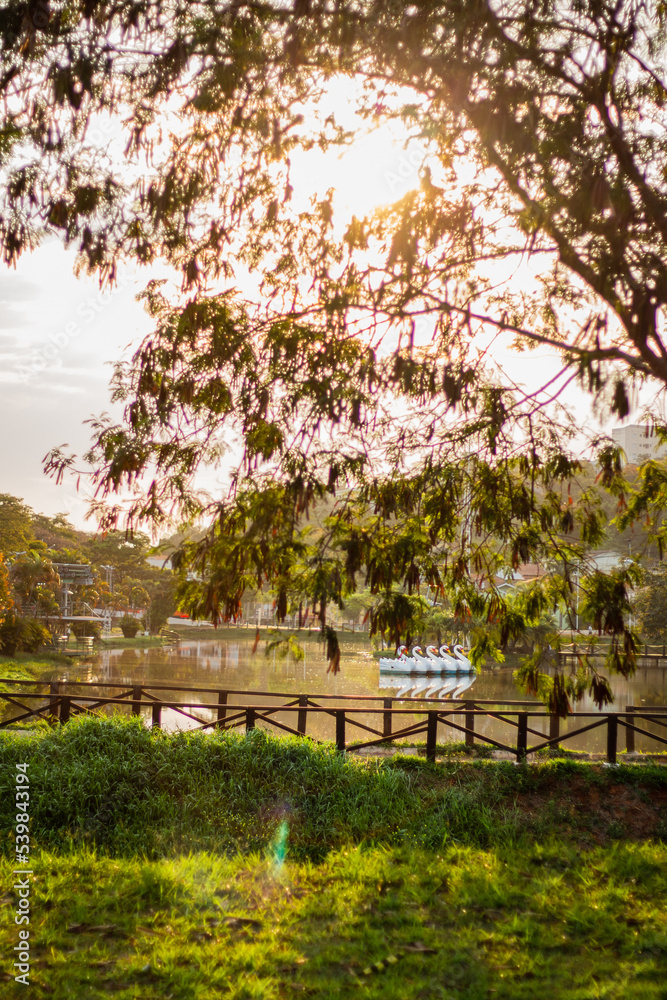 City park trees, lake and pedal boat with gold yellow light. Summer natural background.
