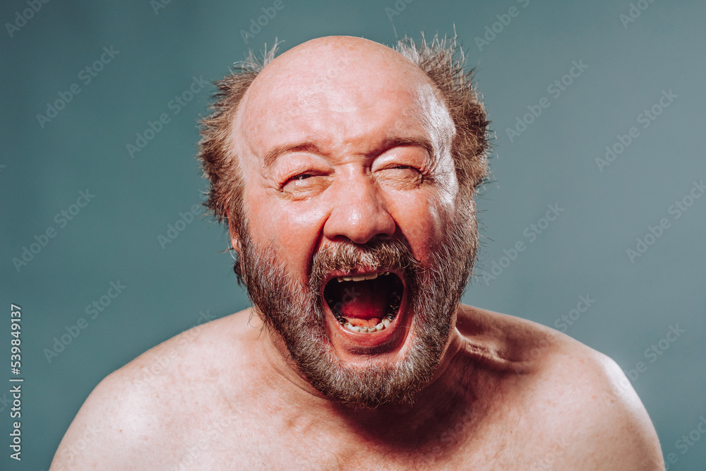 Front view portrait of an senior man with a beard, mustache, bald on the background of a blue studio, wildly screaming, veins swollen on his neck. An elderly person expresses his emotions, grimaces.