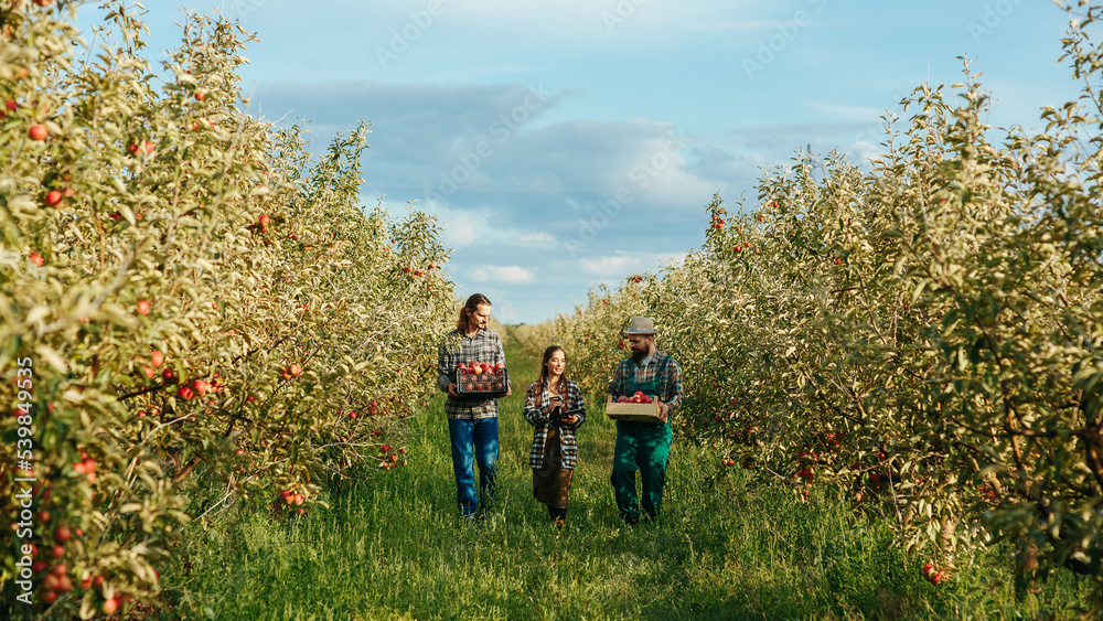 Two bearded mustachioed farmer field workers go and tell a woman about harvesting her tablet. Apple orchard, agricultural business, smiles on faces, success at work. Workers in the apple garden.