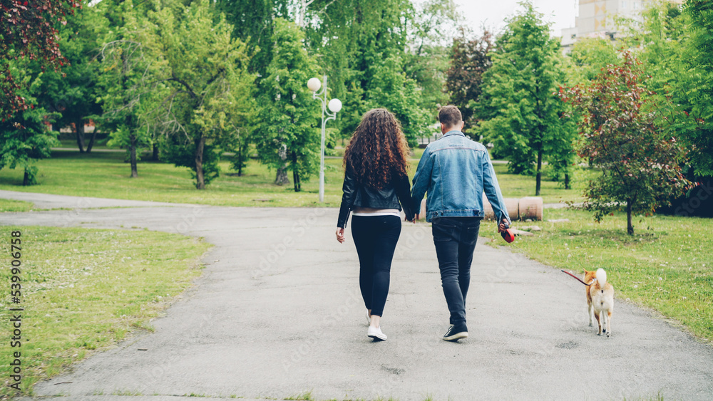 Back view of young people girlfriend and boyfriend walking the dog in city park in summer, man and woman are holding hands, pedigree pet is running enjoying freedom.