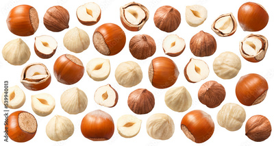 Set of whole, peeled and broken hazelnuts isolated on white background. Collection #3-3.