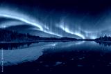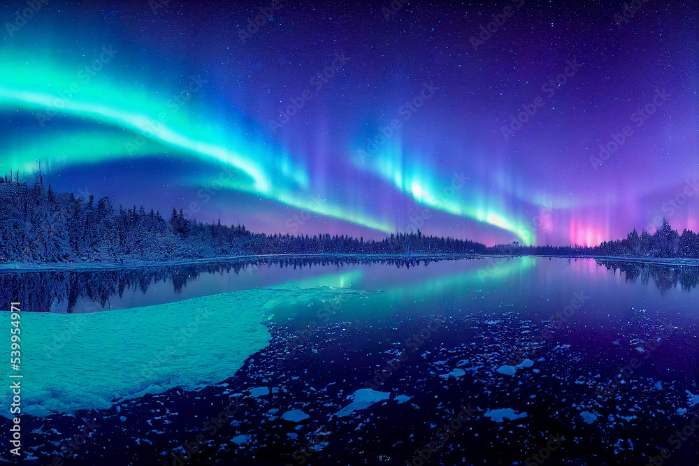 Aurora borealis on the Norway. Green northern lights above mountains. Night sky with polar lights. Night winter landscape with aurora and reflection on the water surface. Natural back