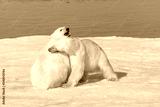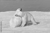 Two young wild polar bear cubs playing on pack ice in Arctic sea, north of Svalbard
