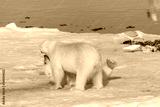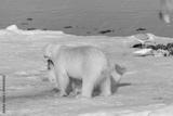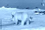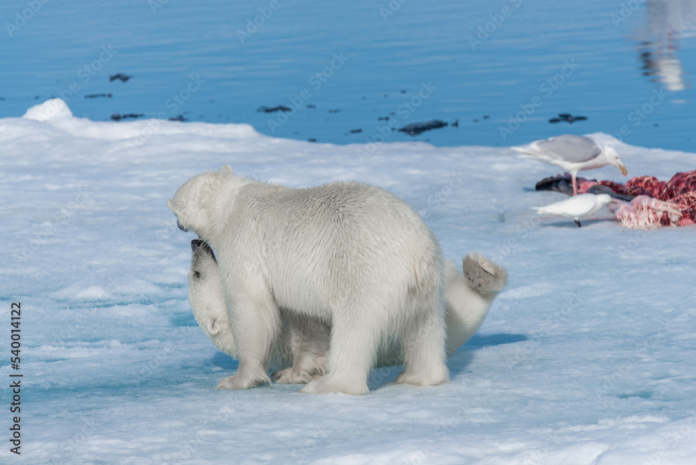 Two young wild polar bear cubs playing on pack ice in Arctic sea, north of Svalbard