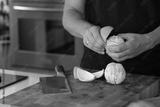 Chef cook cutting fresh orange for fruit salad on wooden cut board