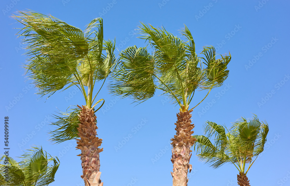 Picture of Doum palm trees on a windy day against the blue sky.