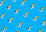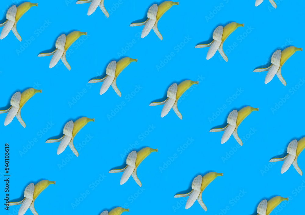 Yellow peeled bananas on the blue background. Pattern. Flat lay.
