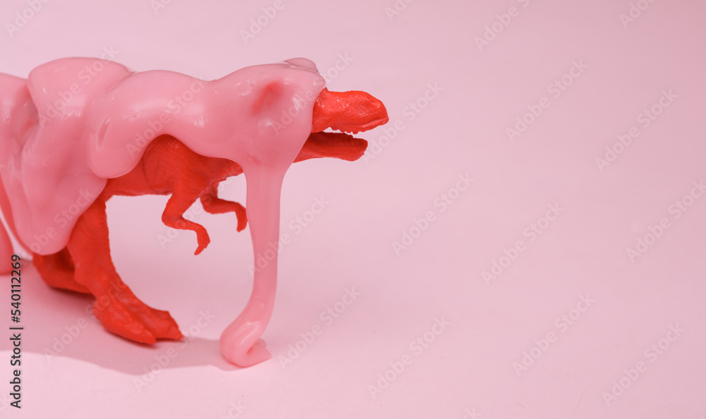 Creative layout, toy tyrannosaurus with slime on pink background with shadow. Visual trend. Fresh idea. Concept pop