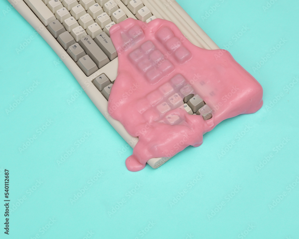 Creative retro layout, Old keyboard with slime on blue pastel background. Visual trend. Fresh idea