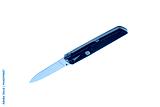 Pocket folding knife isolate on white back. Compact metal sharp knife with a folding blade.