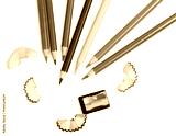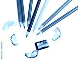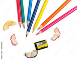 Set of colored pencils of different colors and a sharpener with shavings
