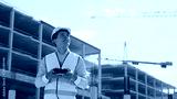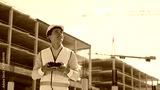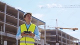 Drone operator holding remote controller. Professional builder in helmet and vest standing in front of construction site. Office building and crane background. Business, real estate and investment.