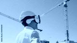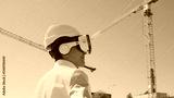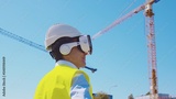 Professional builder in VR helmet standing in front of construction site and using virtual and augmented reality technologies. Office building and crane background. Real estate and investment.