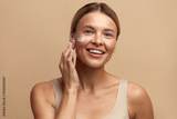 Skin Care Woman Applying Cream on Cheek. Closeup Of Beautiful Smiling Girl Putting Cream On Fresh Soft Pure Skin. Portrait Of Woman With Natural Makeup Applying Beauty Cosmetics Product