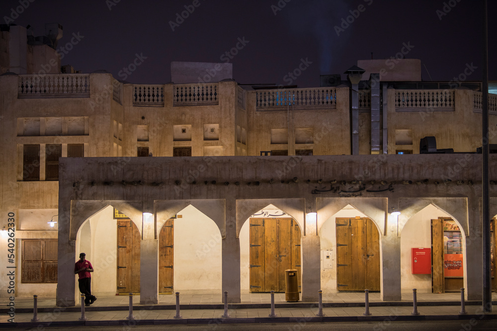 Doha, Qatar, May 5,2022: Traditional Arabian building built of wood and mud decorated with a facade in the traditional Arabic style.