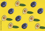Ripe whole and cut blue plums with leaves on the yellow background. Pattern. Flat lay.
