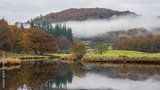 Beautiful Autumn landscape image of River Brathay in Lake District lookng towards Langdale Pikes with fog across river and vibrant woodlands