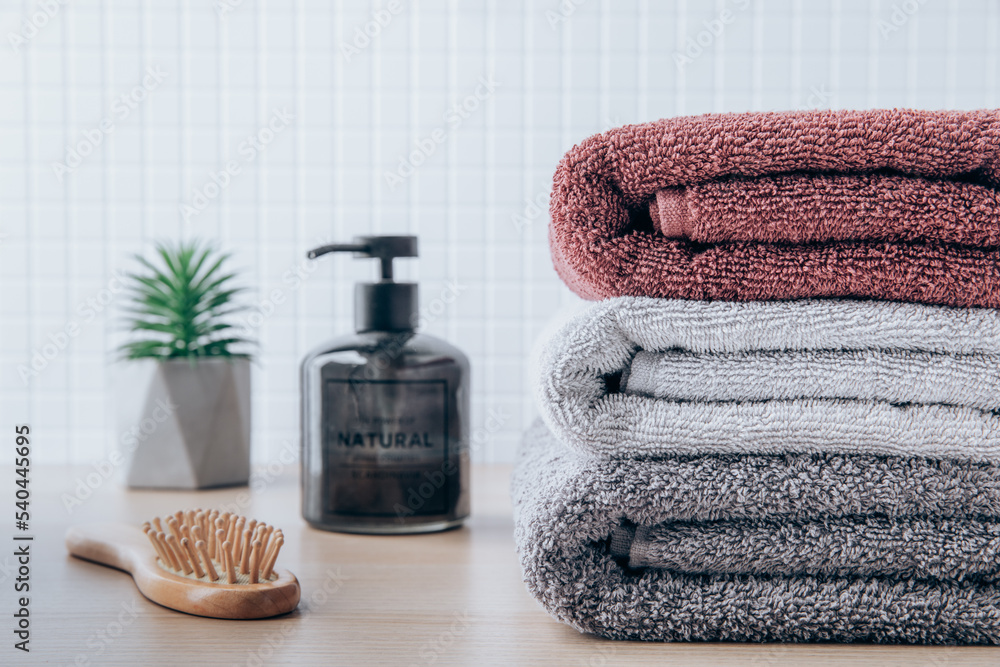 Towels. Clean fresh fluffy towels and bath accessories on table in bathroom